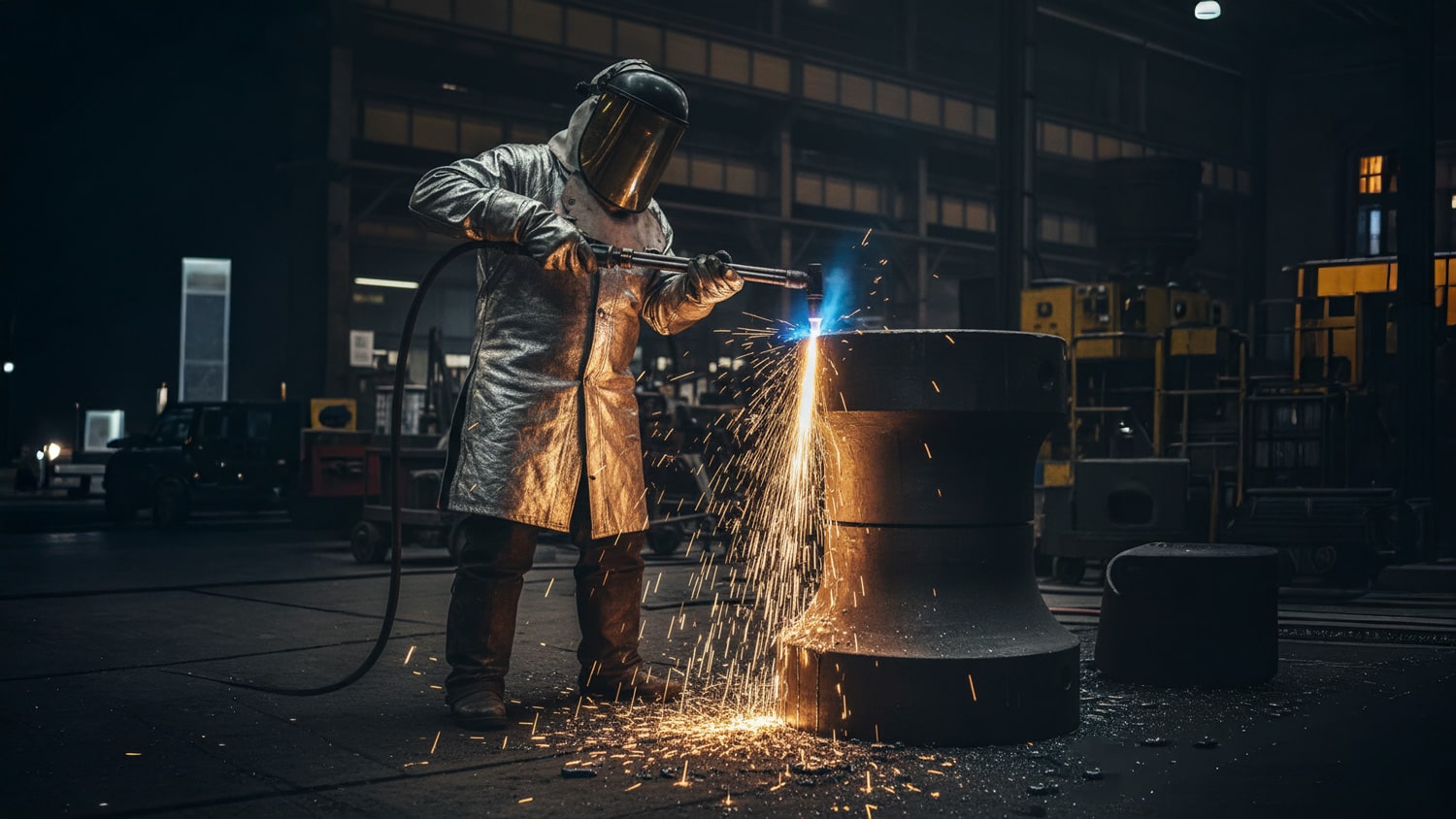 During pouring, extra metal fills the “gates” (channels) and “risers” (feeders). These must now be removed. For ductile iron or smaller parts, we may use hydraulic wedges. For large steel castings, we use Oxy-Fuel torches or Plasma cutters to slice through thick metal sections. This separation is critical to separate the product from the scrap metal that will be remelted.